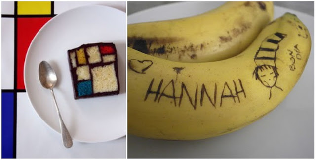 Delicious and arty: The Mondrian cake by Beau à la louche and bananas with love messages by El hada de papel.